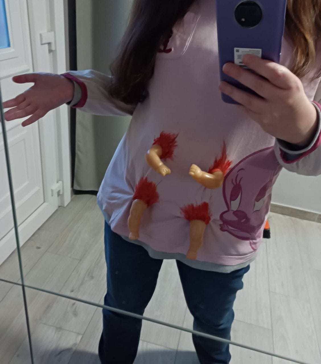 J’ai utilisé un vieux pyjama et j’ai acheté une vieille poupée d’occasion, à 50 centimes. J’ai découpé mon haut de pyjama pour y faire passer les jambes et les bras de la poupée, et j’ai badigeonné tout ça de ketchup pour simuler du sang !