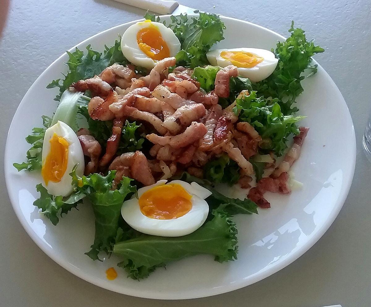 Un jour, je mangeais chez ma tata (ma tante), et elle a annoncé qu’elle avait fait “une salade avec des lardons”.